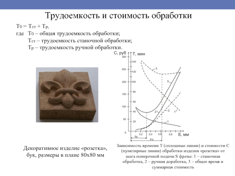 Зависимость времени Т (сплошные линии) и стоимости С (пунктирные линии) обработки изделия «розетка» от шага поперечной подачи S фрезы: 1 – станочная обработка, 2 – ручная доработка, 3 – общее время и суммарная стоимость