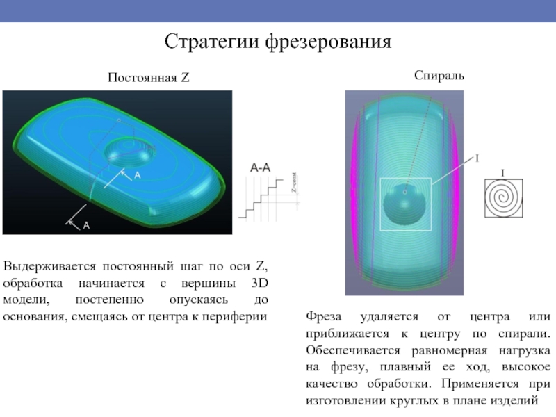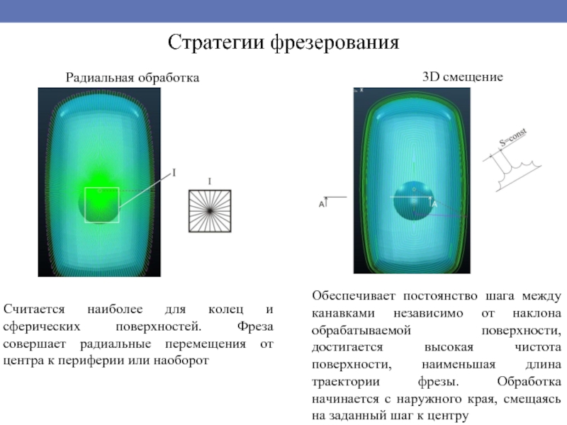 Обеспечивает постоянство шага между канавками независимо от наклона обрабатываемой поверхности, достигается высокая чистота поверхности, наименьшая длина траектории фрезы. Обработка начинается с наружного края, смещаясь на заданный шаг к центру
