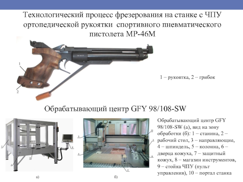 Обрабатывающий центр GFY 98/108-SW (а), вид на зону обработки (б): 1 – станина, 2 – рабочий стол, 3 – направляющие,