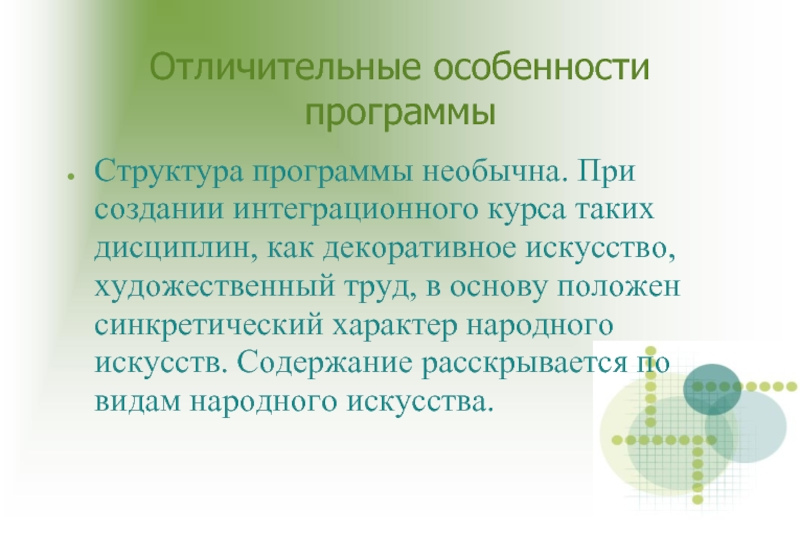 как декоративное искусство, художественный труд, в основу положен синкретический характер народного искусств. Содержание расскрывается по видам народного искусства.