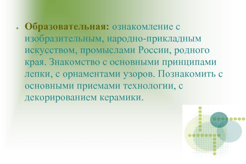 Слайд 6Образовательная: ознакомление с изобразительным, народно-прикладным искусством, промыслами России, родного края. Знакомство