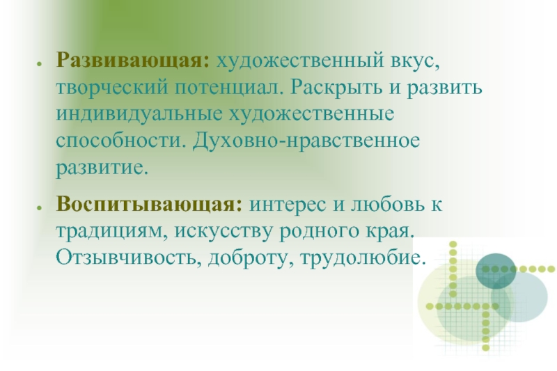 Слайд 7Развивающая: художественный вкус, творческий потенциал. Раскрыть и развить индивидуальные художественные способности.