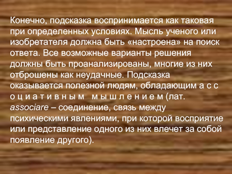 Так как новая техническая задача чаще всего не может быть решена традиционными способами, то у изобретателя возникает своего рода познавательно-психологический барьер, затруднение Для его преодоления нужен своеобразный трамплин, который поможет подняться на новую высоту и решить задачу. Иногда трамплин-подсказка возникает как бы неожиданно, из совершенно иной области жизни, из неожиданного наблюдения. Предания и легенды из жизни изобретателей и ученых пестрят необычными подсказкам, приводившими к преодолению барьера: это и ньютоново яблоко, и ванна Архимеда