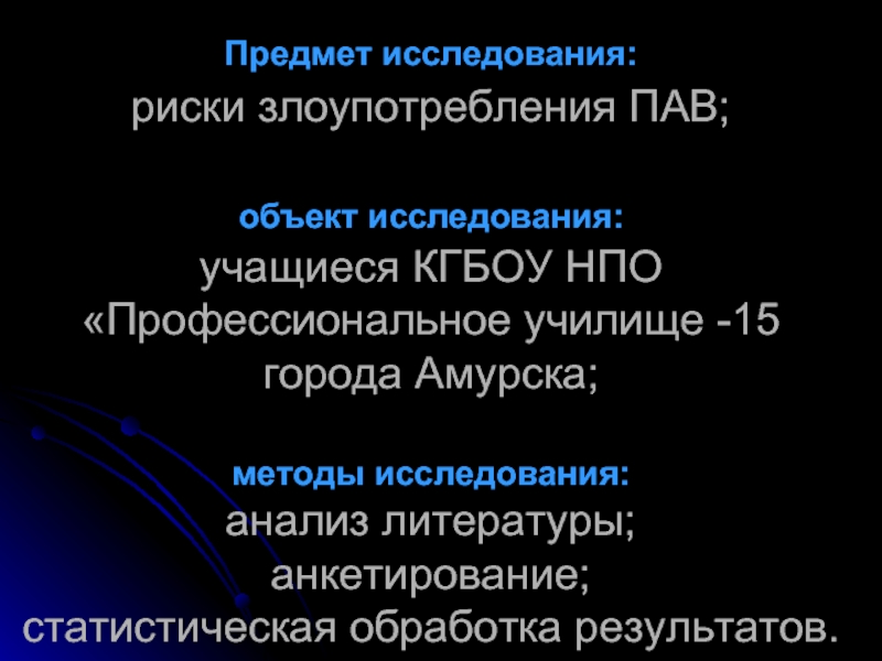 Слайд 2Цель: изучить риски злоупотребления ПАВ учащимися профессионального училища - 15