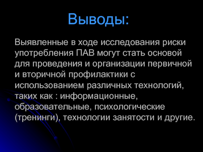 основой для проведения и организации первичной и вторичной профилактики с использованием различных технологий, таких как : информационные, образовательные, психологические (тренинги), технологии занятости и другие.