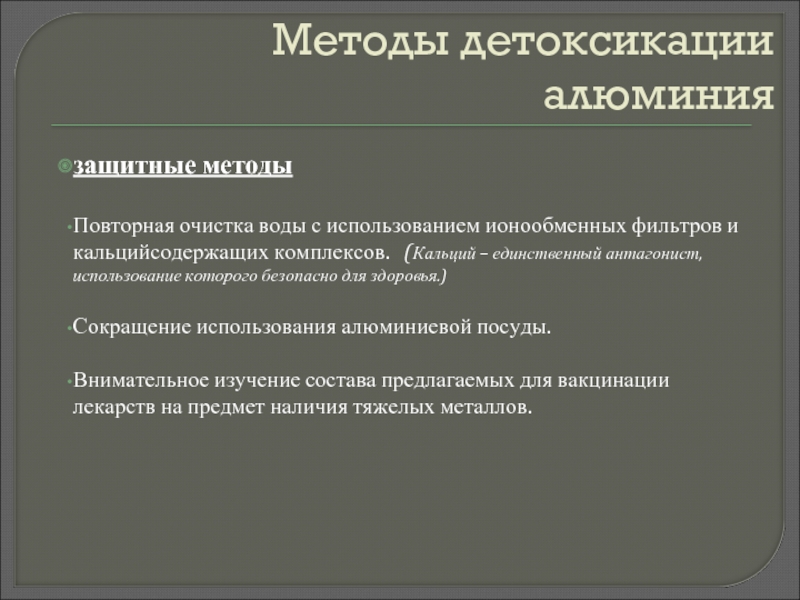 антагонистов, замедляющих всасывание алюминия и восполняющих дефицит жизненно важных веществ. В первую очередь это лекарственные препараты и БАДП, содержащие кальций, магний, фосфор, цинк, марганец, железо и медь.