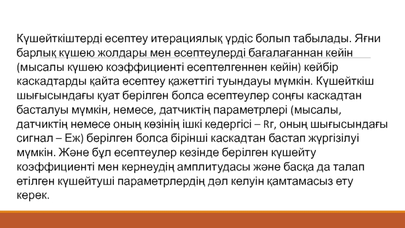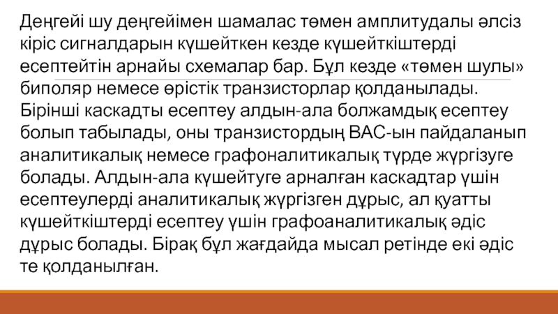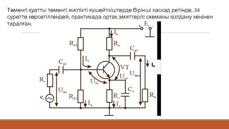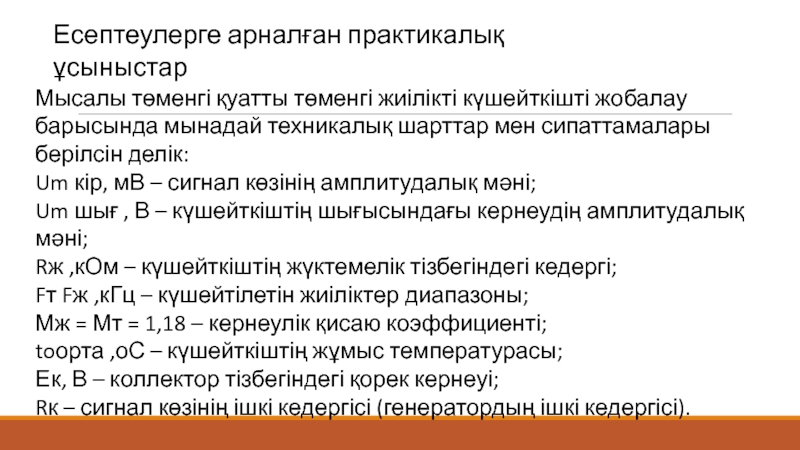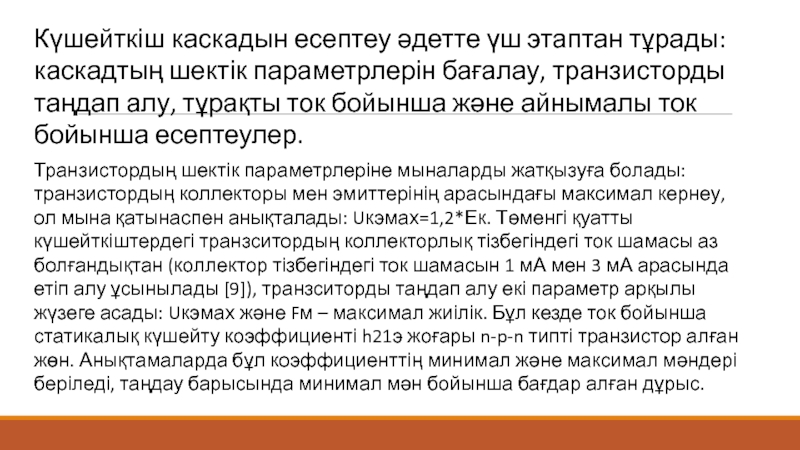 Транзистордың шектік параметрлеріне мыналарды жатқызуға болады: транзистордың коллекторы мен эмиттерінің арасындағы максимал кернеу, ол мына қатынаспен анықталады: Uкэмах=1,2*Ек. Төменгі қуатты күшейткіштердегі транзситордың коллекторлық тізбегіндегі ток шамасы аз болғандықтан (коллектор тізбегіндегі ток шамасын 1 мА мен 3 мА арасында етіп алу ұсынылады [9]), транзситорды таңдап алу екі параметр арқылы жүзеге асады: Uкэмах және Fм – максимал жиілік. Бұл кезде ток бойынша статикалық күшейту коэффициенті h21э жоғары n-p-n типті транзистор алған жөн. Анықтамаларда бұл коэффициенттің минимал және максимал мәндері беріледі, таңдау барысында минимал мән бойынша бағдар алған дұрыс.