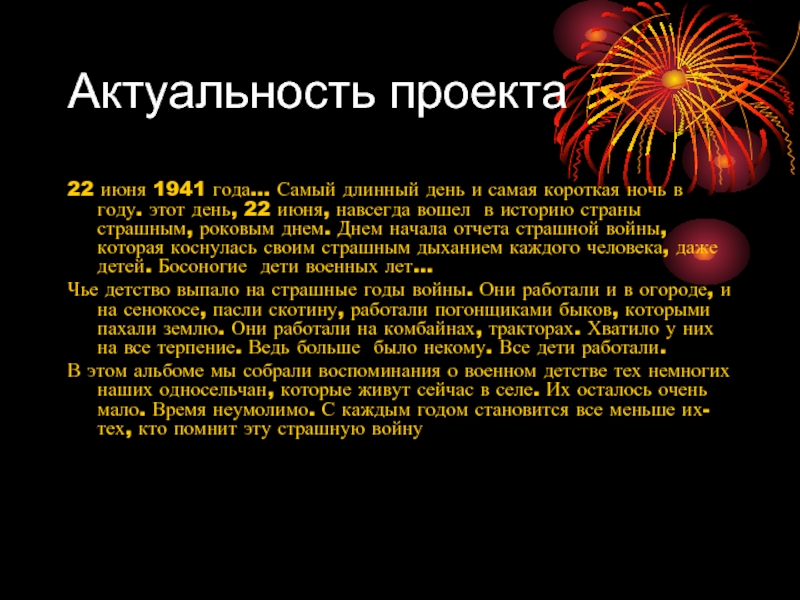 ночь в году. этот день, 22 июня, навсегда вошел в историю страны страшным, роковым днем. Днем начала отчета страшной войны, которая коснулась своим страшным дыханием каждого человека, даже детей. Босоногие дети военных лет…