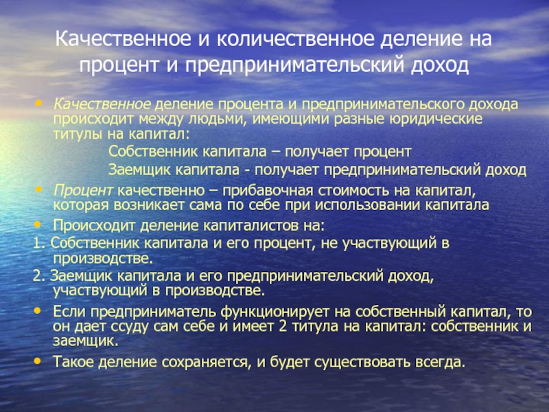 Слайд 5Качественное и количественное деление на процент и предпринимательский доход