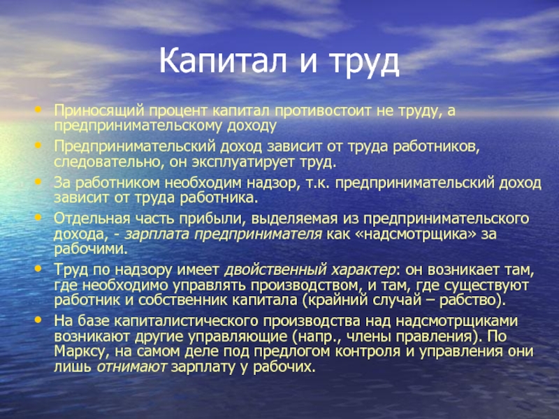 Труд по надзору имеет двойственный характер: он возникает там, где необходимо управлять производством, и там, где существуют работник и собственник капитала (крайний случай – рабство).