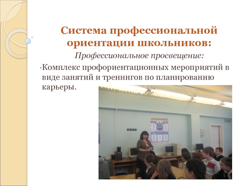 Информационно-просветительская деятельность участников учебно-воспитательного процесса в области профессионального определения и профильной подготовки в школе.