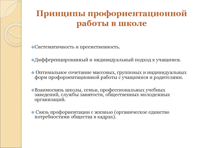 Оптимальное сочетание массовых, групповых и индивидуальных форм профориентационной работы с учащимися и родителями.