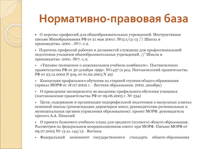 • Приказ Министерства образования Российской Федерации от 21.06.99 № 36 "О плане мероприятий по профессиональной ориентации учащейся молодежи и профессиональной переподготовке незанятых выпускников учреждений высшего и среднего профессионального образования ";