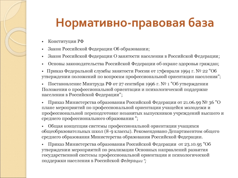 • Приказ Министерства образования Российской Федерации от 23.10.95 "Об утверждении мероприятий по реализации Основных направлений развития государственной системы профессиональной ориентации и психологической поддержки населения в Российской Федерации ";