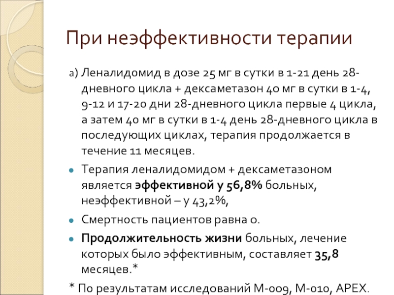 1-21 день 28-дневного цикла + дексаметазон 40 мг в сутки в 1-4, 9-12 и 17-20 дни 28-дневного цикла первые 4 цикла, а затем 40 мг в сутки в 1-4 день 28-дневного цикла в последующих циклах, терапия продолжается в течение 11 месяцев.