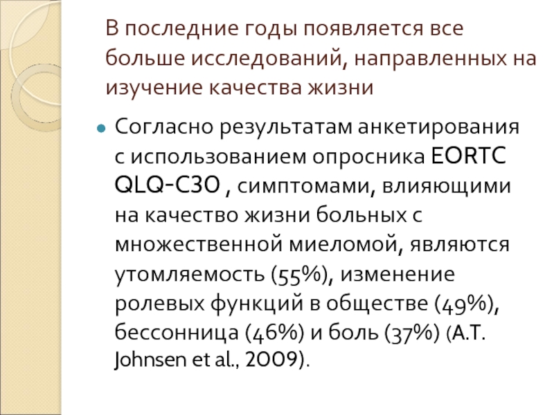 Согласно результатам анкетирования с использованием опросника EORTC QLQ-C30 , симптомами, влияющими на качество жизни больных с множественной миеломой, являются утомляемость (55%), изменение ролевых функций в обществе (49%), бессонница (46%) и боль (37%) (A.T. Johnsen et al., 2009).