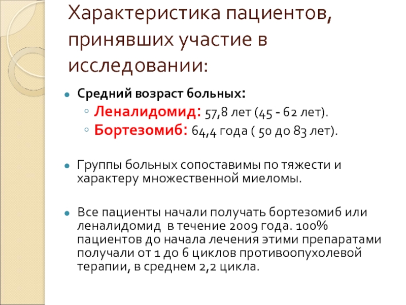 Все пациенты начали получать бортезомиб или леналидомид в течение 2009 года. 100% пациентов до начала лечения этими препаратами получали от 1 до 6 циклов противоопухолевой терапии, в среднем 2,2 цикла.