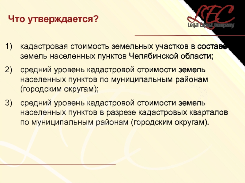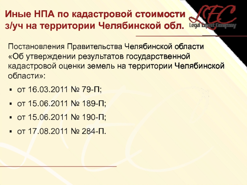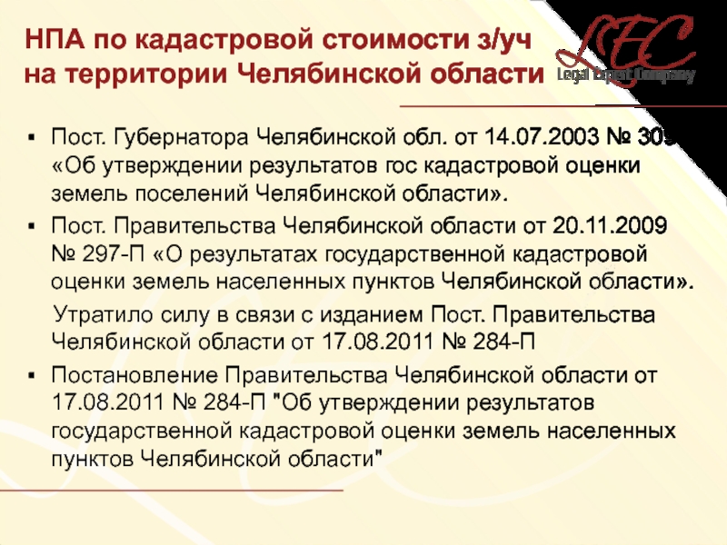 Челябинской обл. от 14.07.2003 № 309 «Об утверждении результатов гос кадастровой оценки земель поселений Челябинской области».