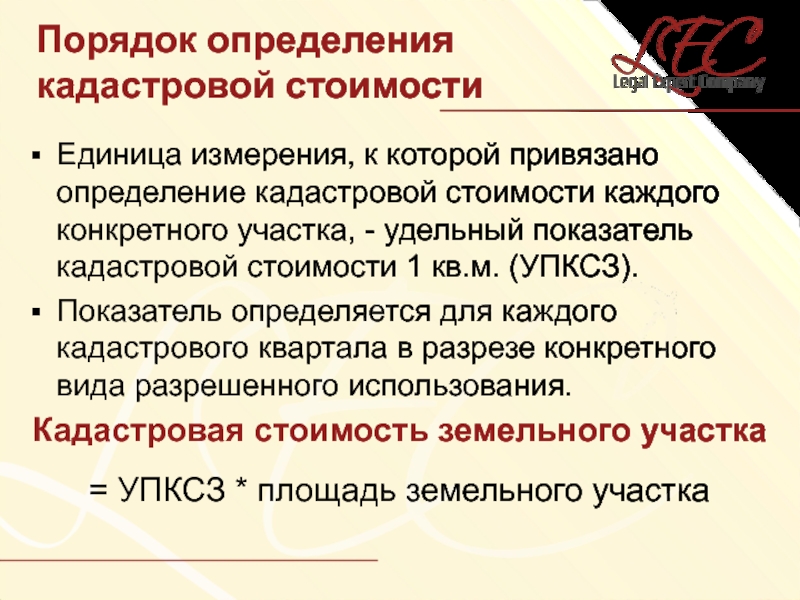 Кадастровая стоимость земельного участка = УПКСЗ * площадь земельного участка