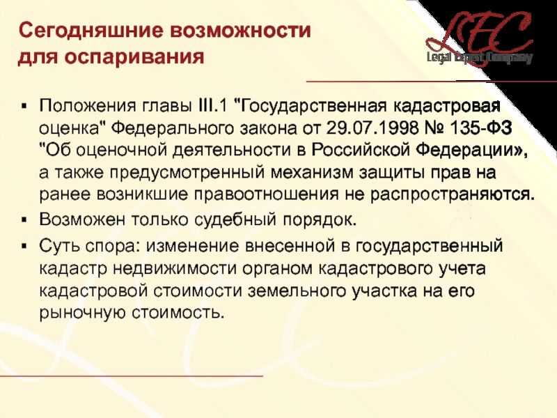 от 29.07.1998 № 135-ФЗ "Об оценочной деятельности в Российской Федерации», а также предусмотренный механизм защиты прав на ранее возникшие правоотношения не распространяются.