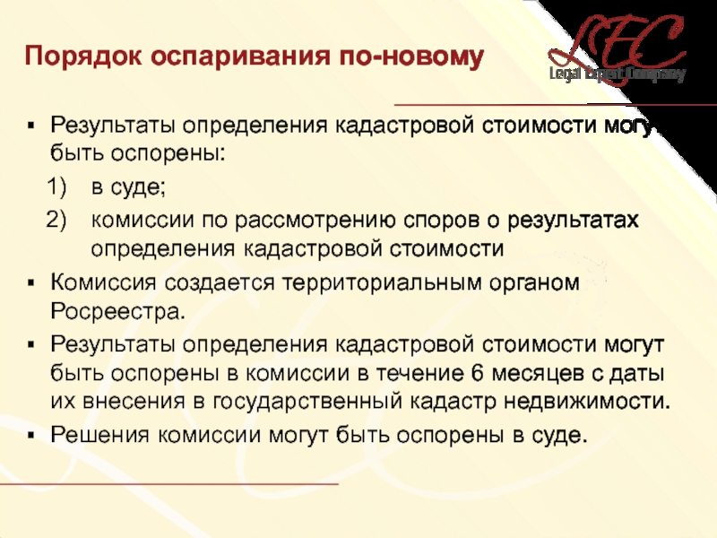Результаты определения кадастровой стоимости могут быть оспорены в комиссии в течение 6 месяцев с даты их внесения в государственный кадастр недвижимости.