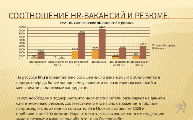 Также необходимо подчеркнуть что многие соискатели размещают на данном сайте несколько резюме; соответственно это нашло отражение в таблице: например, число активных соискателей в Москве составляет 8028 и опубликовано 9490 резюме. Надо отметить, что сохраняется та же тенденция: «много резюме и мало вакансий», что  и на Суперджобе.