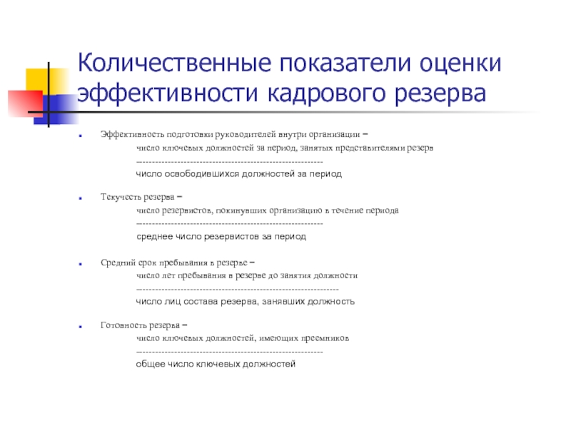 Слайд 11Количественные показатели оценки эффективности кадрового резерва