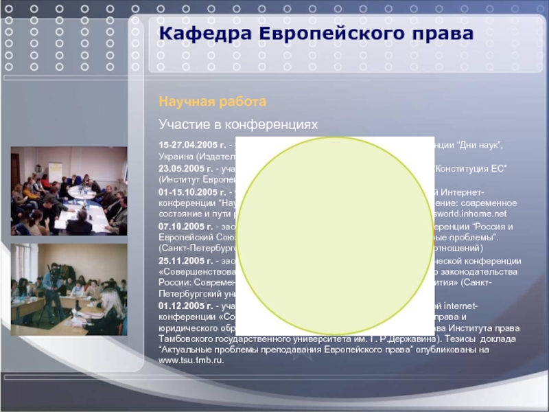 01.12.2005 г. - участие в 2-ой Всероссийской научно-практической internet-конференции «Современные актуальные вопросы государства, права и юридического образования» (Кафедра теории государства и права Института права Тамбовского государственного университета им. Г. Р.Державина). Тезисы доклада “Актуальные проблемы преподавания Европейского права” опубликованы на www.tsu.tmb.ru.