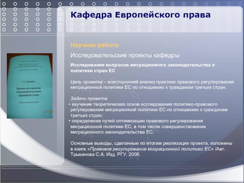 Основные выводы, сделанные по итогам реализации проекта, изложены в книге «Правовое регулирование миграционной политики ЕС» /Авт. Трыканова С.А. Изд. РГУ. 2006.
