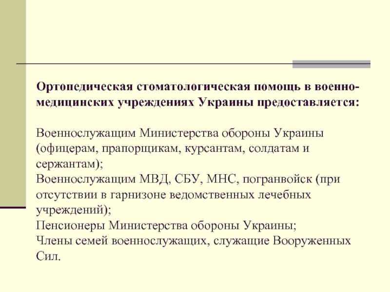 Слайд 44Ортопедическая стоматологическая помощь в военно-медицинских учреждениях Украины предоставляется: