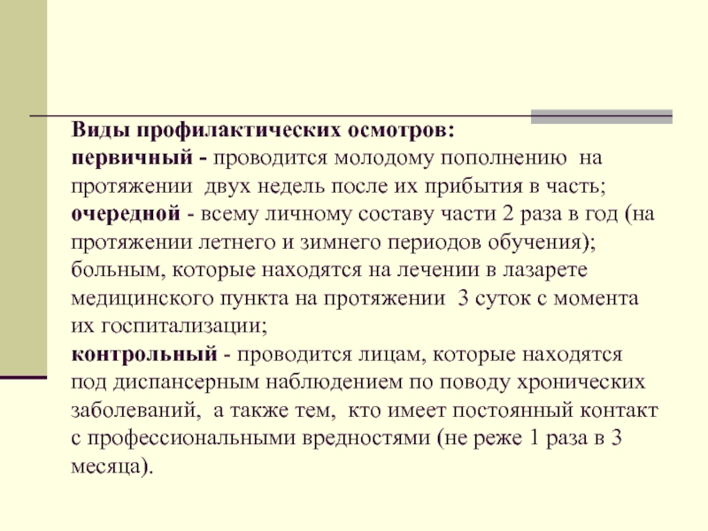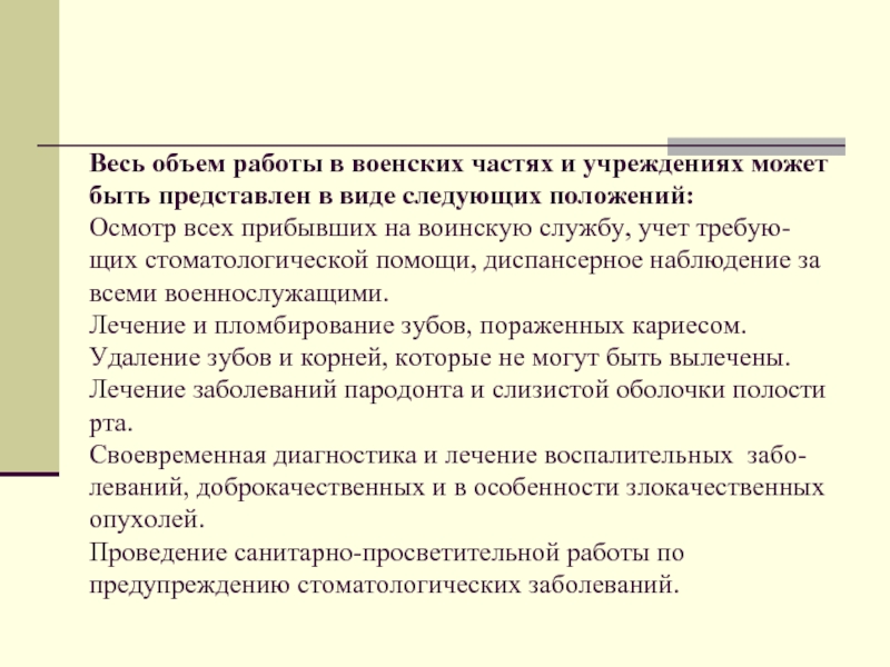 Осмотр всех прибывших на воинскую службу, учет требую-щих стоматологической помощи, диспансерное наблюдение за всеми военнослужащими.