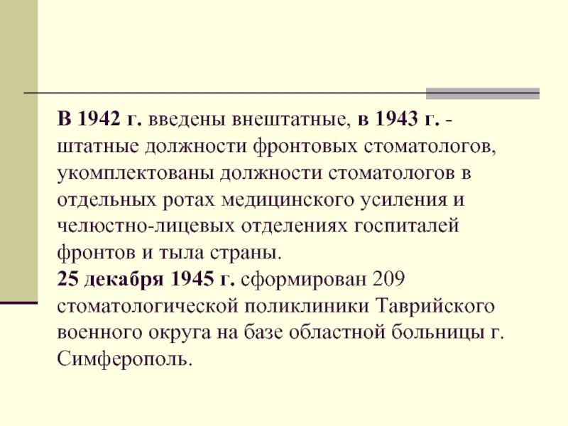 фронтовых стоматологов, укомплектованы должности стоматологов в отдельных ротах медицинского усиления и челюстно-лицевых отделениях госпиталей фронтов и тыла страны.