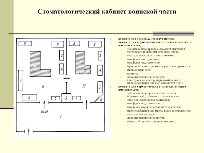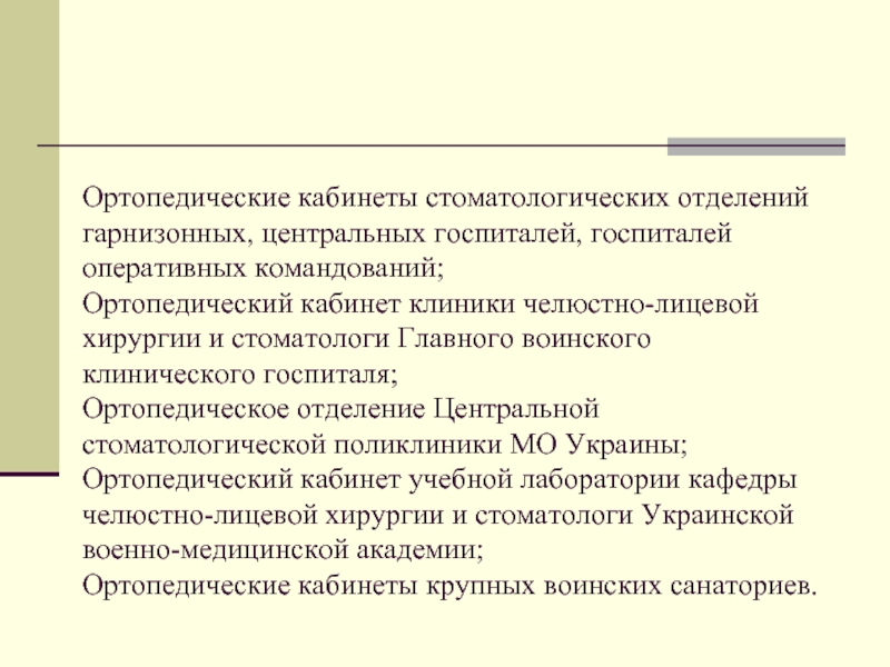 Слайд 43Ортопедические кабинеты стоматологических отделений гарнизонных, центральных госпиталей, госпиталей оперативных командований;