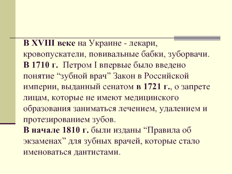 1710 г. Петром I впервые было введено понятие “зубной врач” Закон в Российской империи, выданный сенатом в 1721 г., о запрете лицам, которые не имеют медицинского образования заниматься лечением, удалением и протезированием зубов.