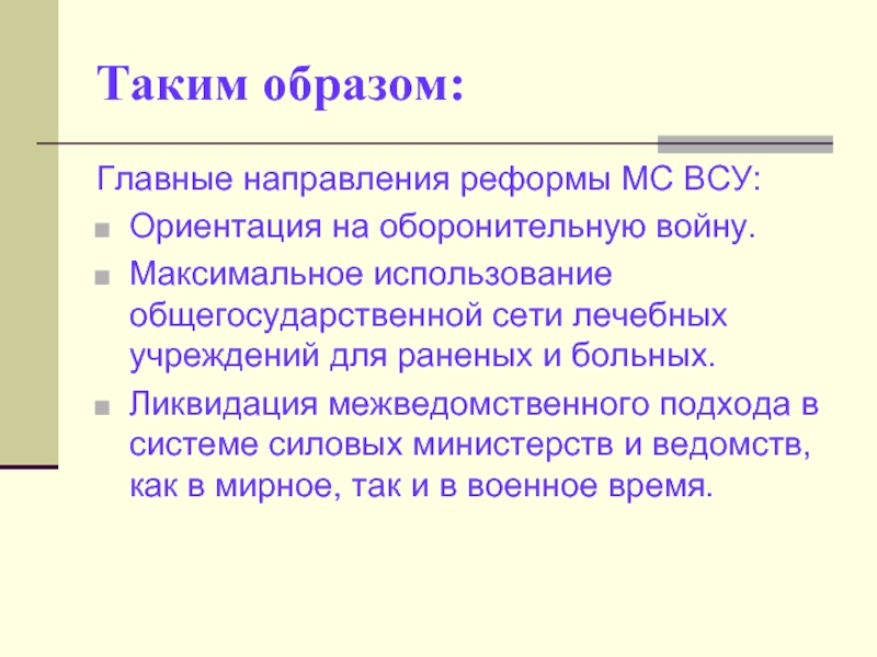 Ликвидация межведомственного подхода в системе силовых министерств и ведомств, как в мирное, так и в военное время.