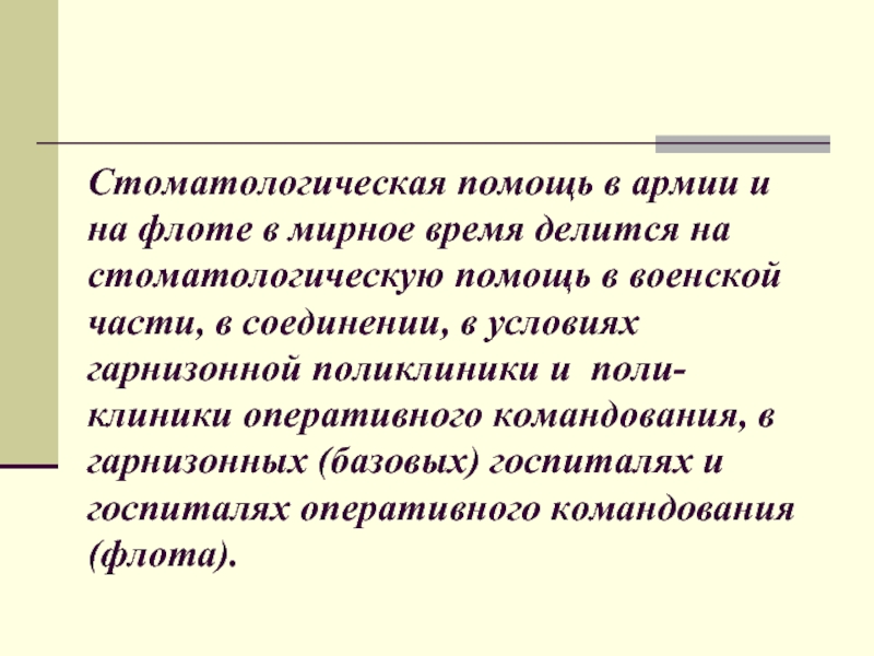Слайд 25Стоматологическая помощь в армии и на флоте в мирное время делится