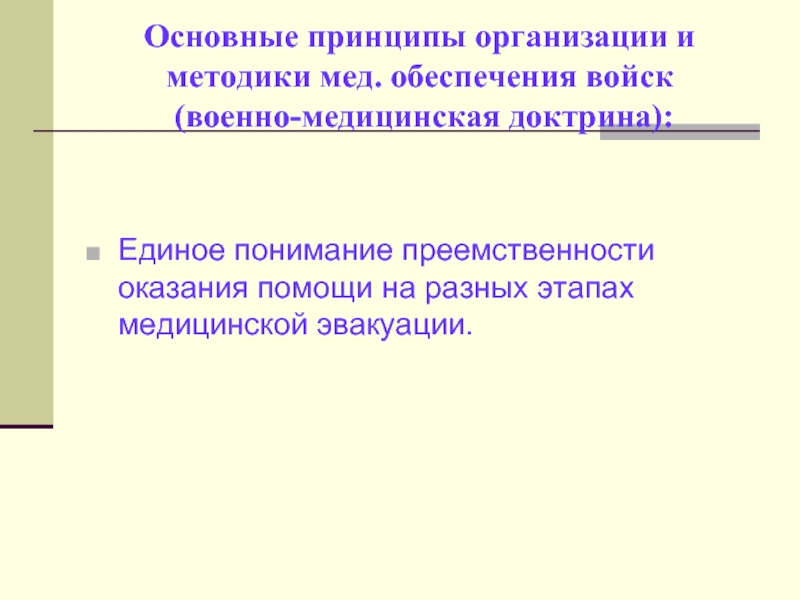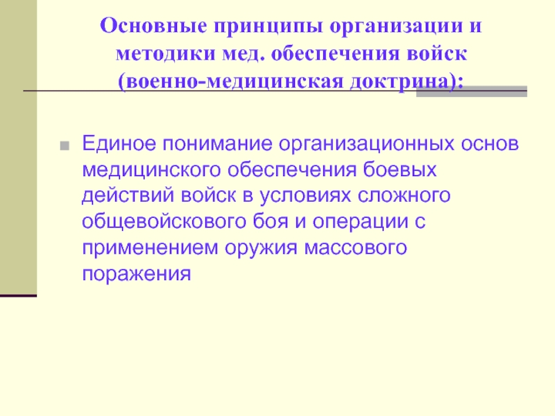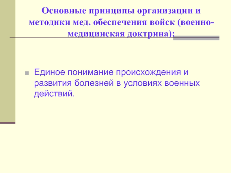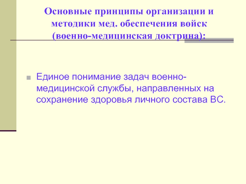 Слайд 8Основные принципы организации и методики мед. обеспечения войск (военно-медицинская доктрина):