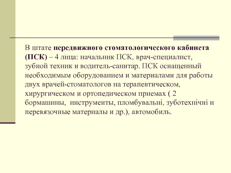 Слайд 39В штате передвижного стоматологического кабинета (ПСК) – 4 лица: начальник ПСК,