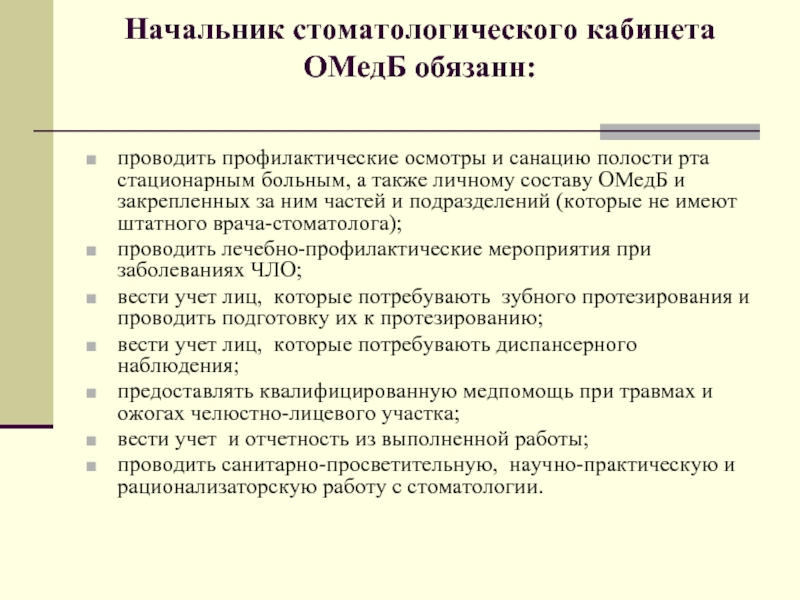 Слайд 34Начальник стоматологического кабинета ОМедБ обязанн: