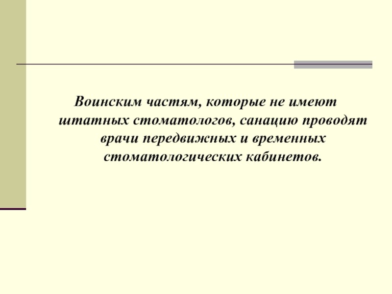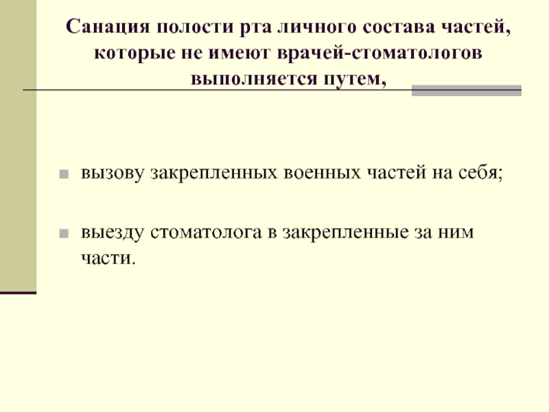 Слайд 35Санация полости рта личного состава частей, которые не имеют врачей-стоматологов выполняется
