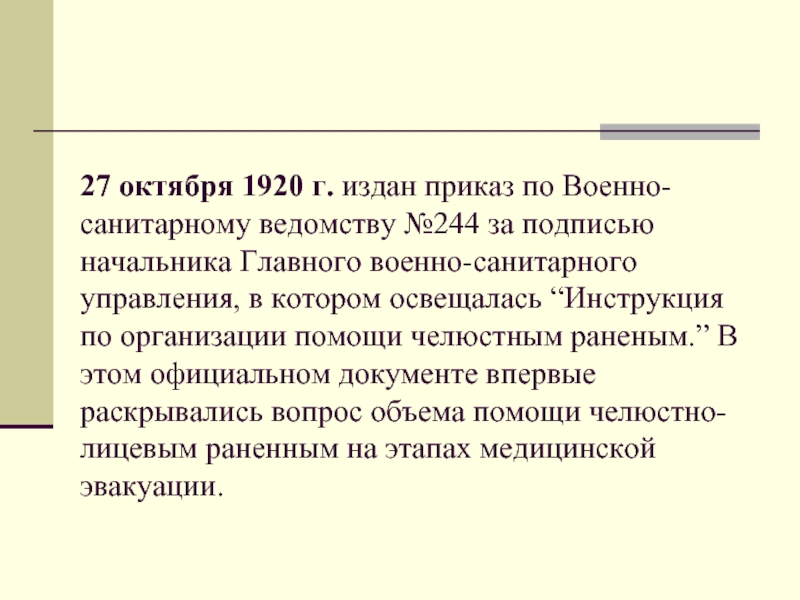 подписью начальника Главного военно-санитарного управления, в котором освещалась “Инструкция по организации помощи челюстным раненым.” В этом официальном документе впервые раскрывались вопрос объема помощи челюстно-лицевым раненным на этапах медицинской эвакуации.