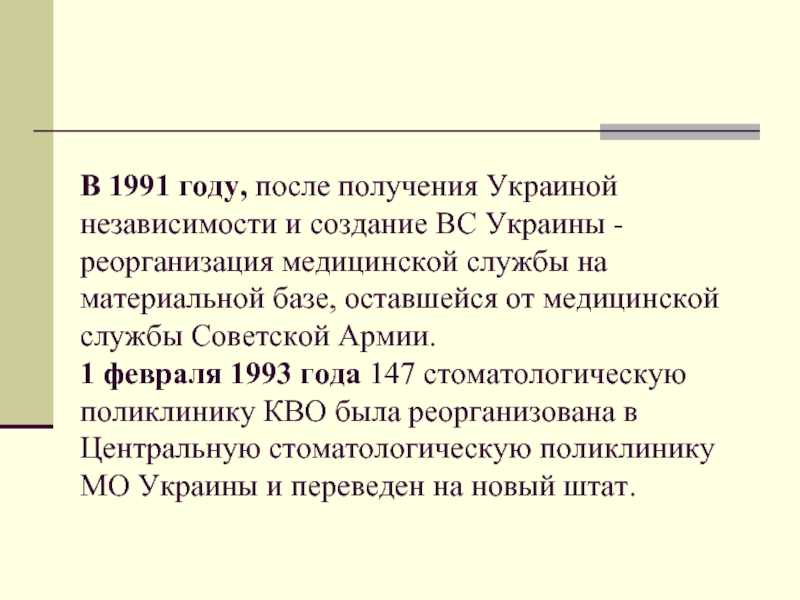 1 февраля 1993 года 147 стоматологическую поликлинику КВО была реорганизована в Центральную стоматологическую поликлинику МО Украины и переведен на новый штат.