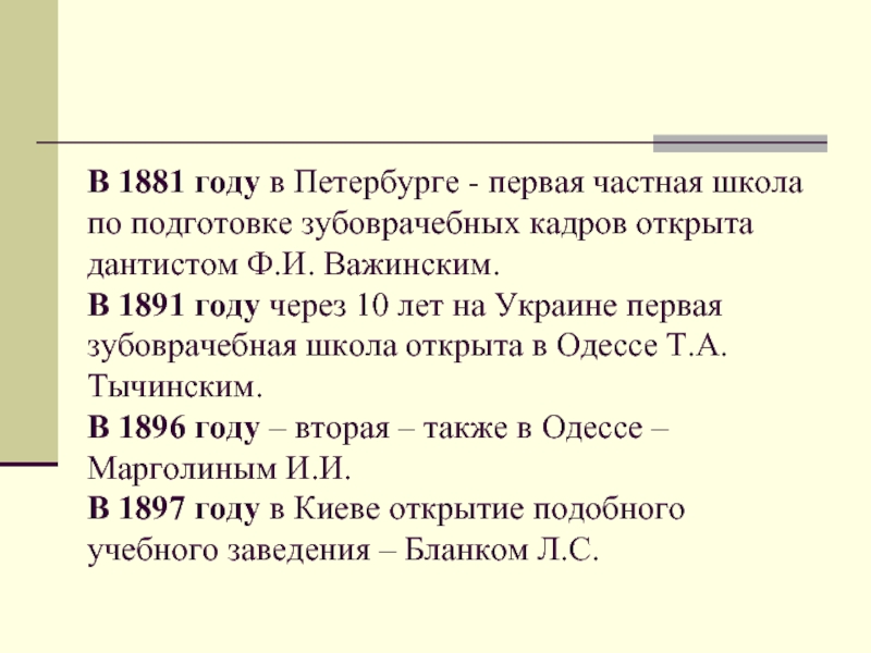 В 1891 году через 10 лет на Украине первая зубоврачебная школа открыта в Одессе Т.А.Тычинским.