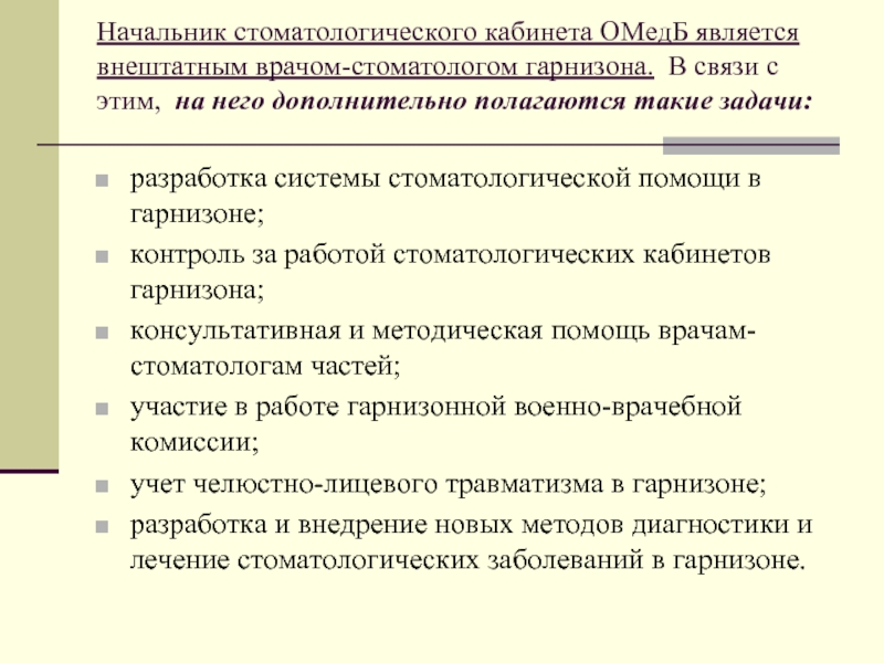 Слайд 37Начальник стоматологического кабинета ОМедБ является внештатным врачом-стоматологом гарнизона. В связи с