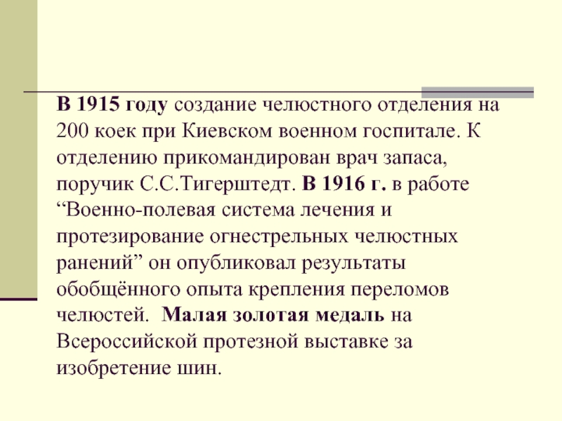 военном госпитале. К отделению прикомандирован врач запаса, поручик С.С.Тигерштедт. В 1916 г. в работе “Военно-полевая система лечения и протезирование огнестрельных челюстных ранений” он опубликовал результаты обобщённого опыта крепления переломов челюстей. Малая золотая медаль на Всероссийской протезной выставке за изобретение шин.