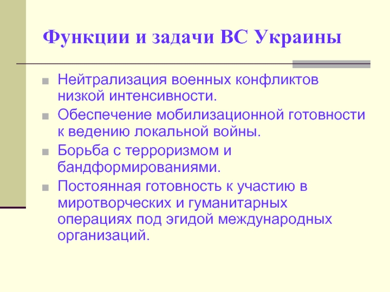 Постоянная готовность к участию в миротворческих и гуманитарных операциях под эгидой международных организаций.