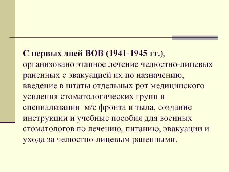 Слайд 18С первых дней ВОВ (1941-1945 гг.), организовано этапное лечение челюстно-лицевых раненных