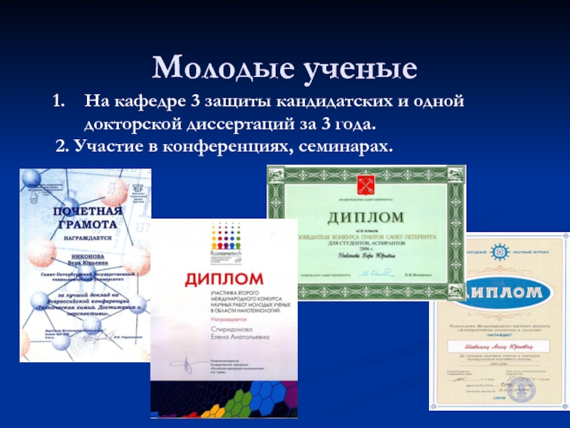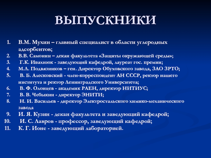 разработки поглотителей, катализаторов для систем жизнеобеспечения космических станций "Салют" и "Мир", спутников серии "Фотон", для глубоководных аппаратов, технологии стабилизации состава рабочей среды в газовых лазерах, технологии блочных осушителей для ракетнокосмических систем.