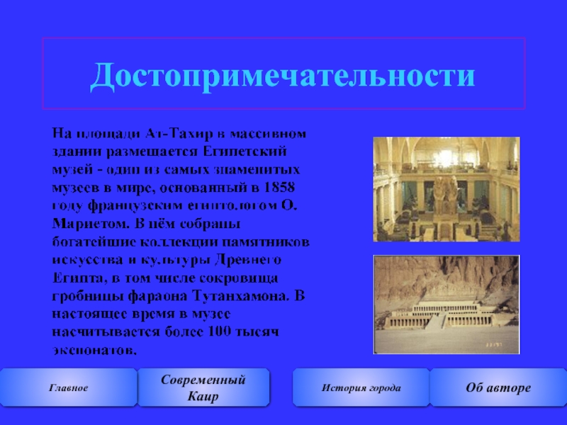 Кварталы города протянулись главным образом вдоль правого берега Нила, а также заняли нильские острова Гезира и Рода, соединенные мостам с остальной частью города. За последние 40 лет стал быстро застраиваться и левый берег Нила. Каир - это высотные дома и виллы, минареты и колокольни, пальмы и неоновые огни.