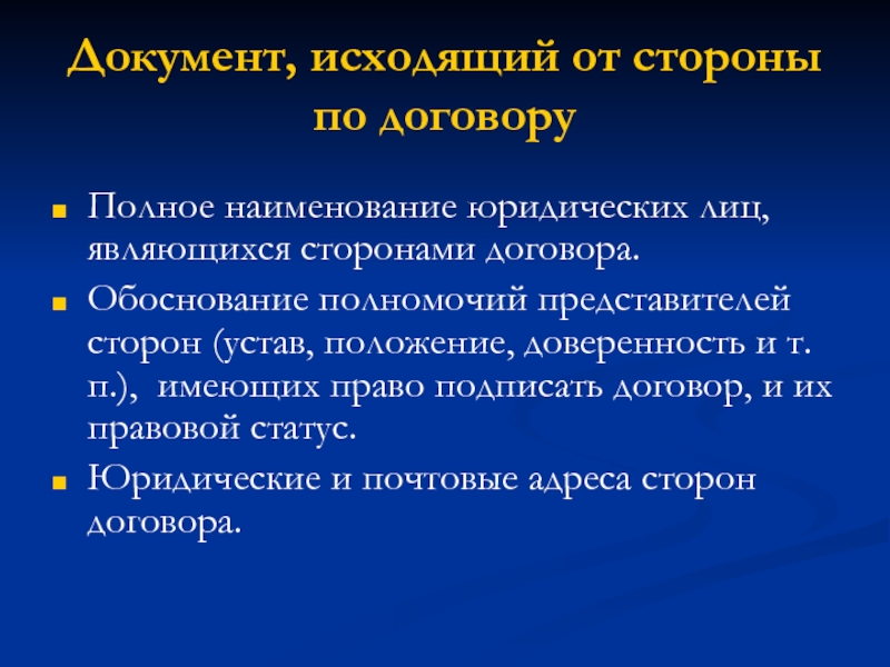 Обоснование полномочий представителей сторон (устав, положение, доверенность и т.п.), имеющих право подписать договор, и их правовой статус.